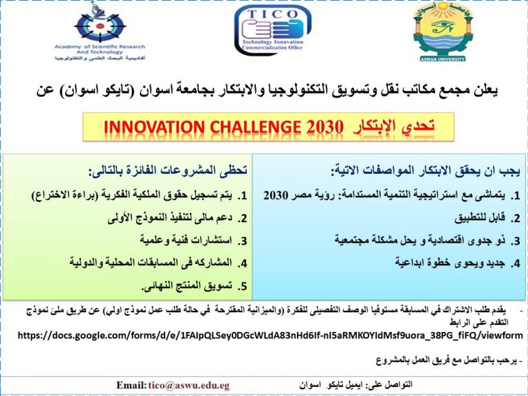 يعلن مجمع مكاتب نقل وتسويق التكنولوجيا والإبتكار بجامعة أسوان عن تحدى الإبتكار(2030) ...